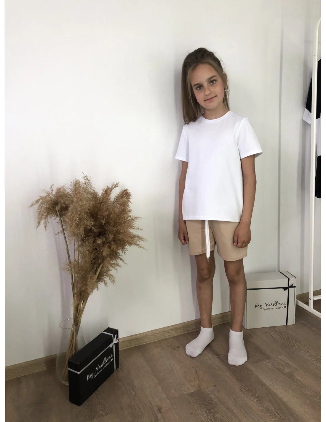 В вашей корзине больше нет товаровКостюм для девочек с бежевыми шортами и футболкой в белом цвете