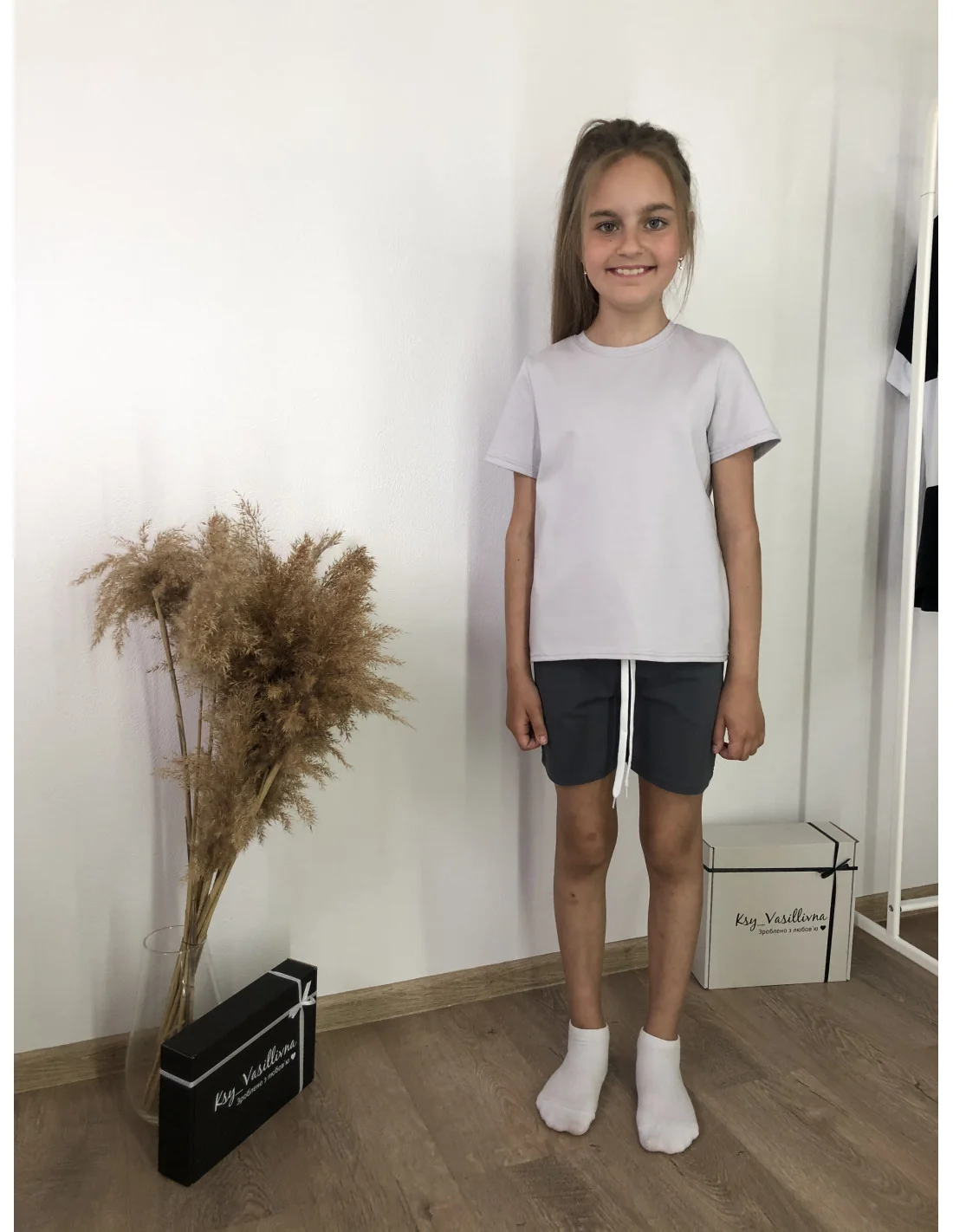 Наш костюм состоит из графитовых шорт и футболки в цвете "камень", создавая изысканный образ для вашей маленькой модницы. Он подчеркнет ее индивидуальность и станет настоящим акцентом в ее гардеробе. 💕