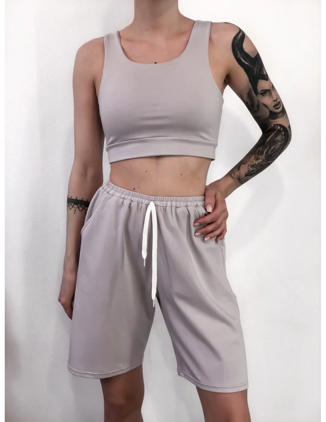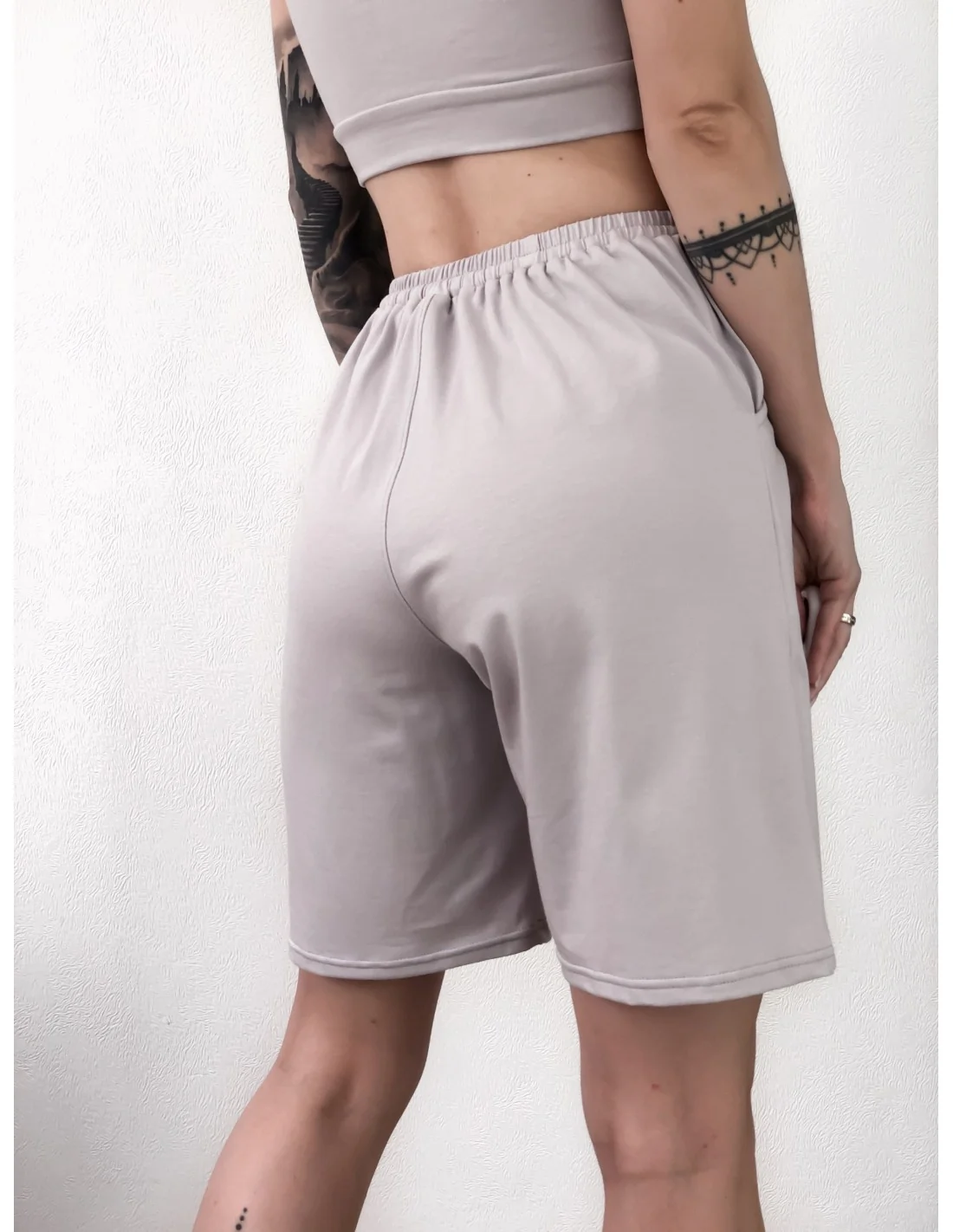 Женские, удлиненные шорты в цвете камень.Идеальный вариант на лето, они удлинены, высокая талия, пояс на резинке, но регулируется шнурком. Изготовлены шорты из натуральной ткани – хлопка, она составляет 95% и всего 5% эластан. Модель спортивная, представленная в самых топовых цветах, которые будут в тренде годами: черный, белый, беж, темно-серый, светло-серый.