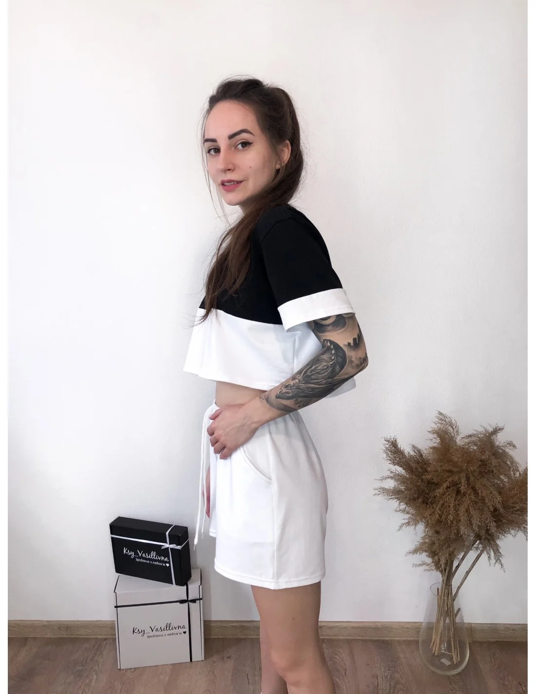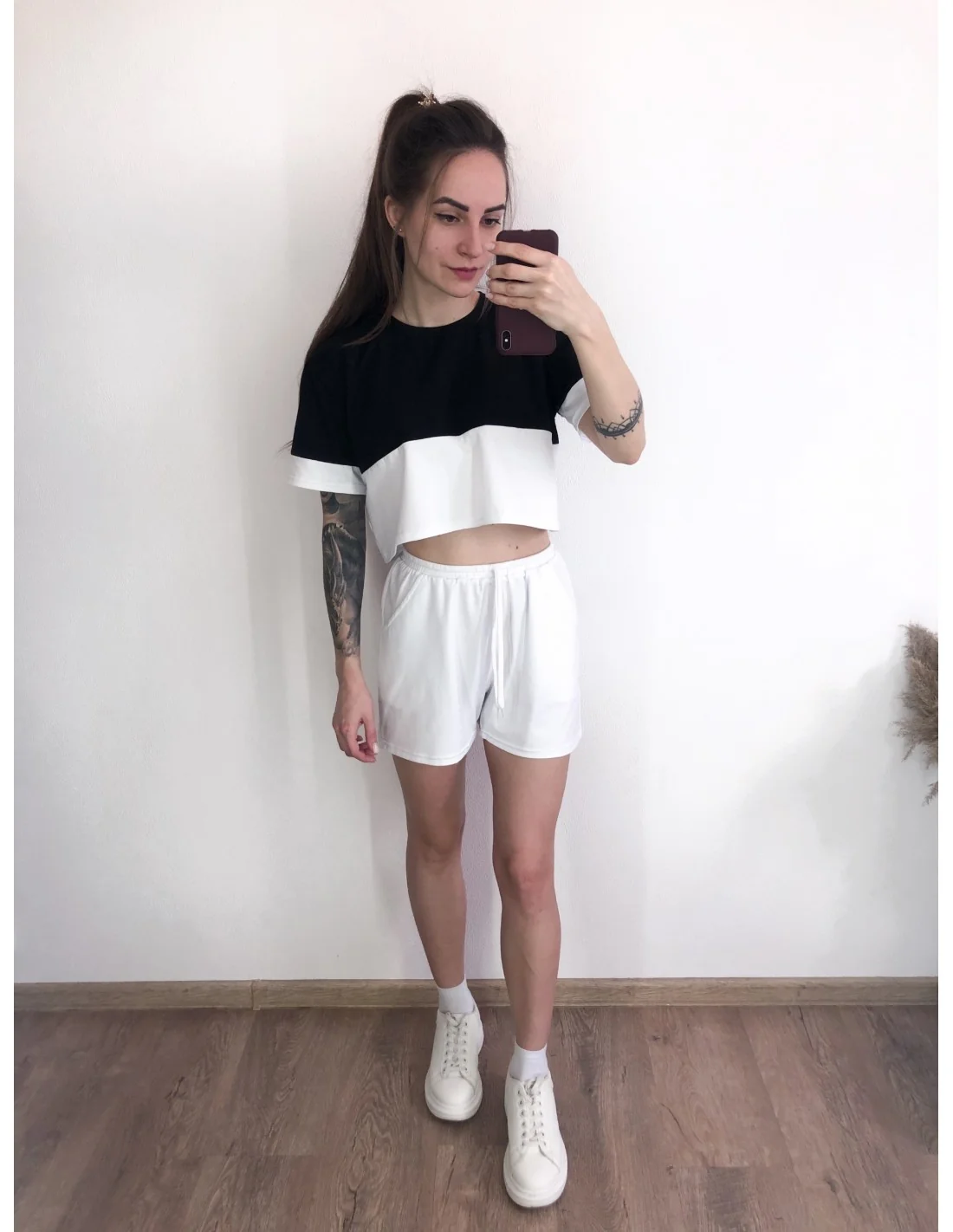 Не хочете витрачати ранкову енергію на довгий вибір одягу? Ми пропонуємо ідеальне рішення - унікальний чорно-білий кроп-топ з короткими білими шортами. Стильний і практичний костюм, який стане вашим вірним супутником в повсякденному житті.