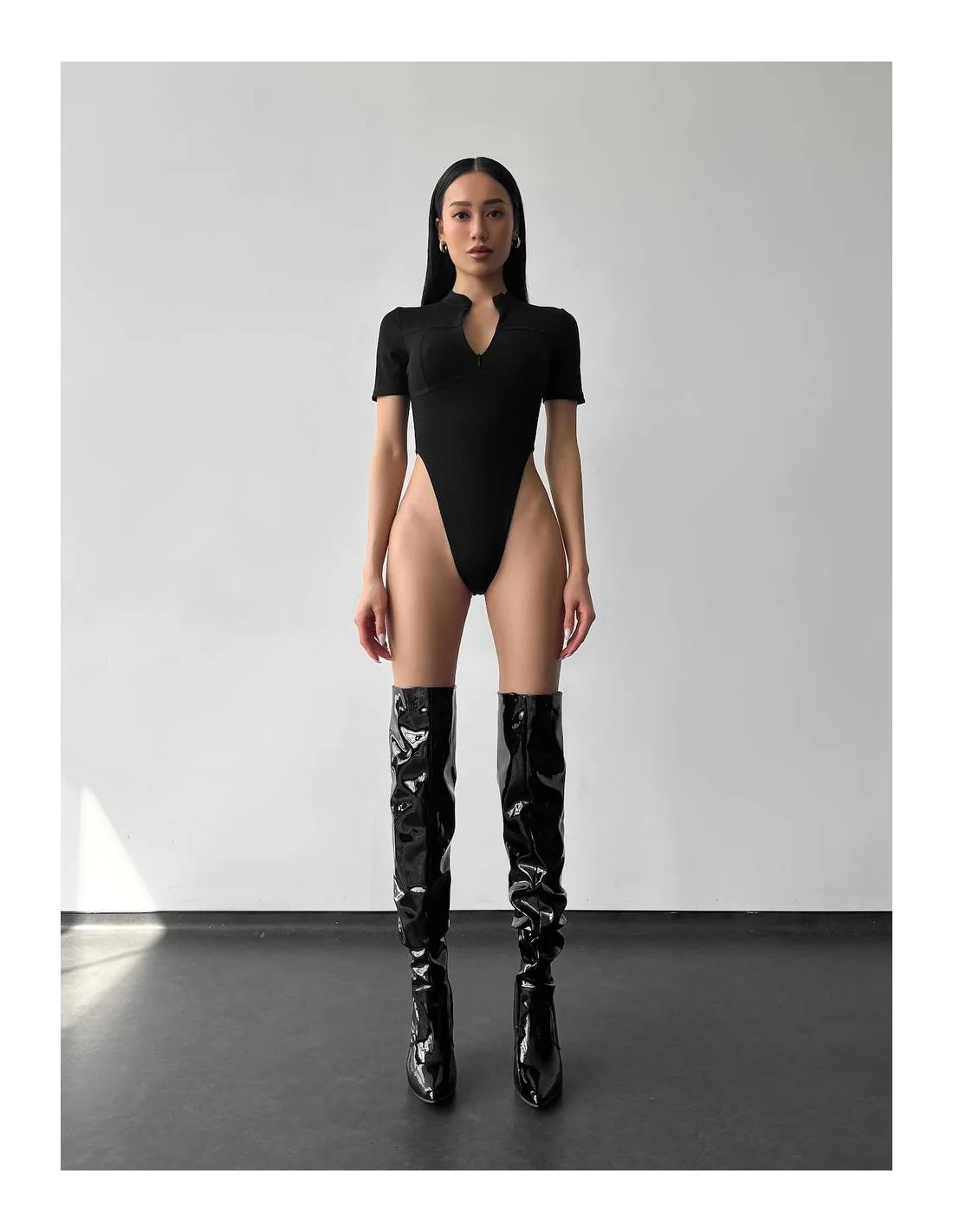 Боди черного цвета с коротким воротником - это универсальное дополнение к вашему гардеробу, которое поможет создать стильные образы для различных событий. Оно подходит как для повседневной носки в сочетании с джинсами или шортами, так и для создания элегантного образа в паре с юбкой или брюками. Не упустите возможность приобрести это изделие и добавить немного роскоши и комфорта в свой гардероб.