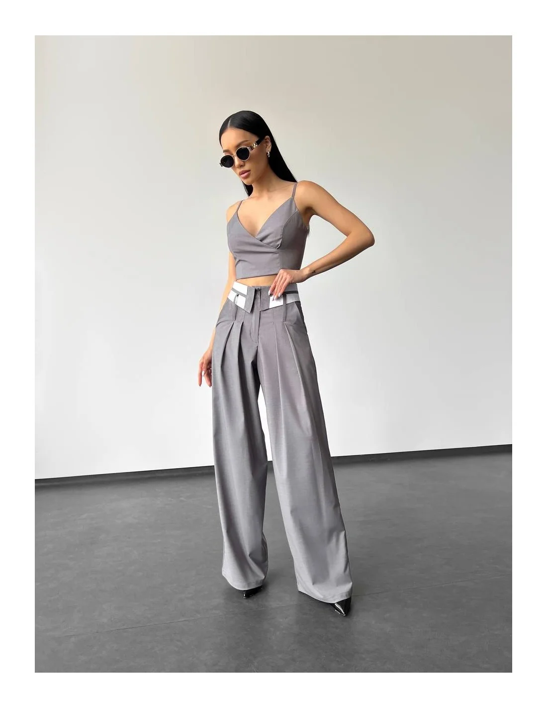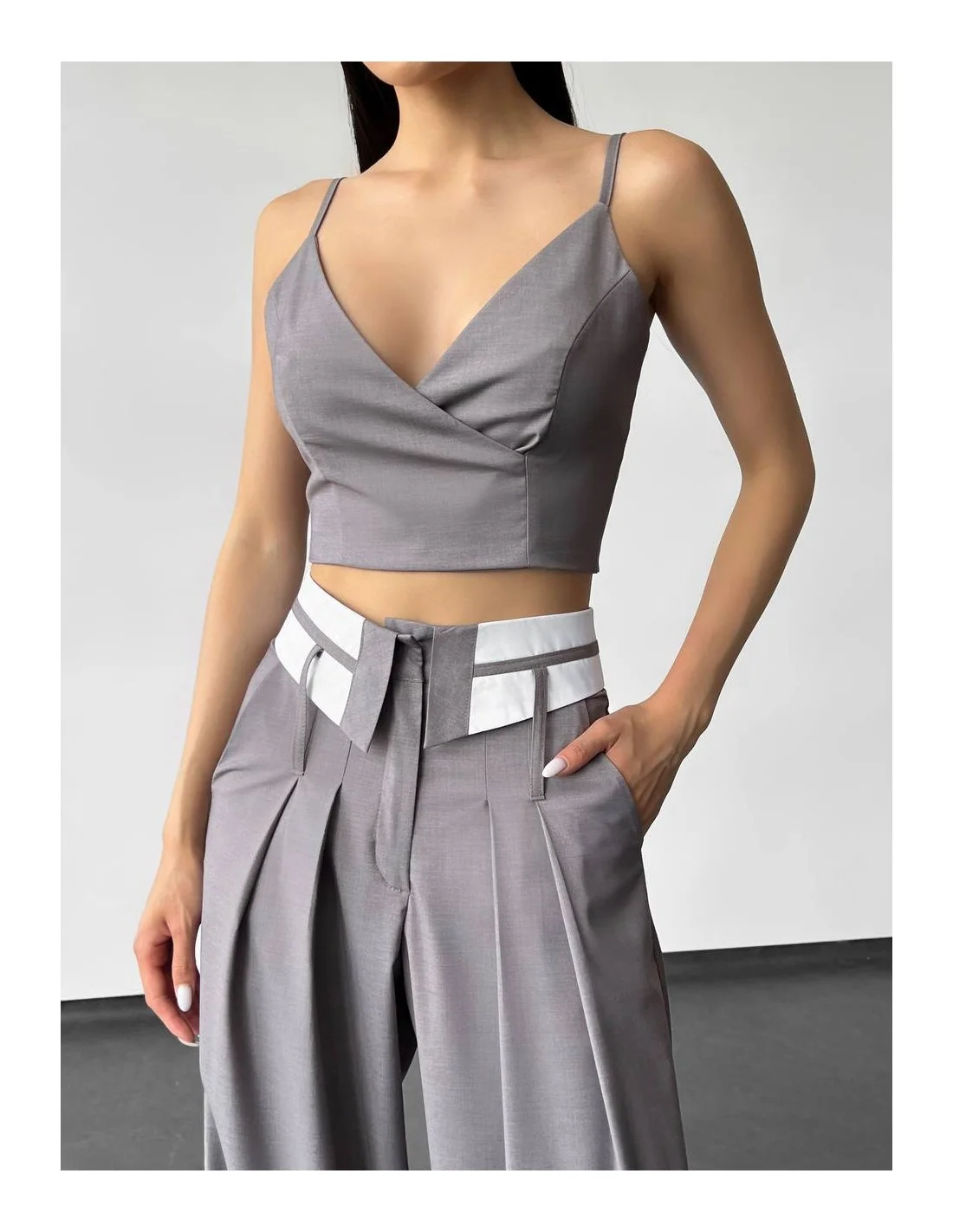 - Топ с красивым вырезом: Верх этого костюма — это топ с изысканным вырезом, который подчеркнет вашу шею и декольте. Этот элемент придает образу женственность и остроту.