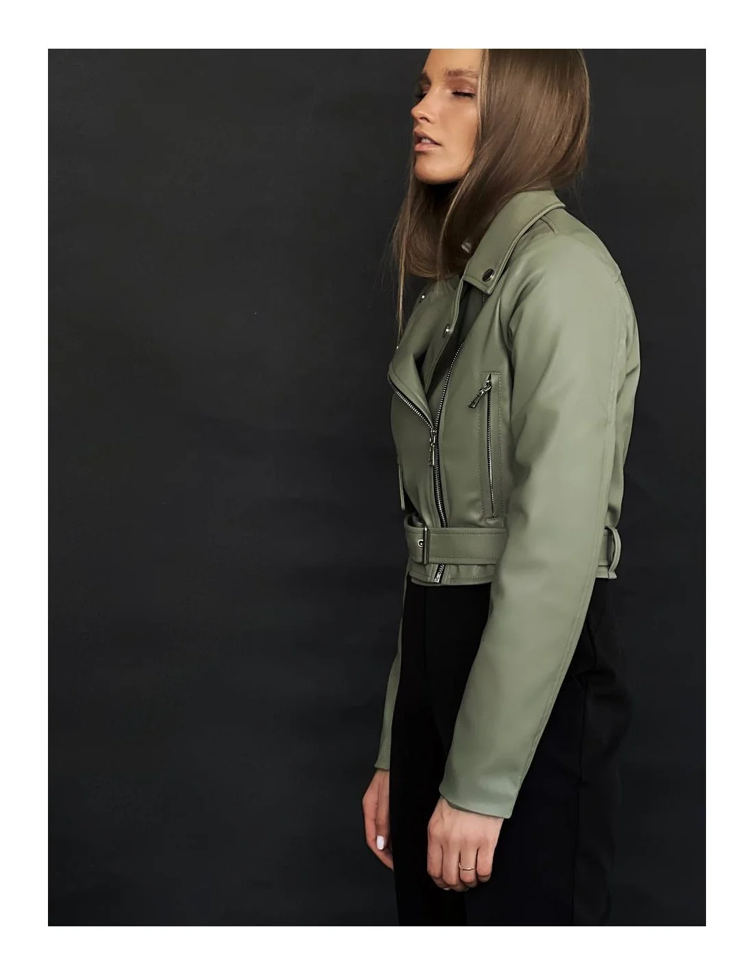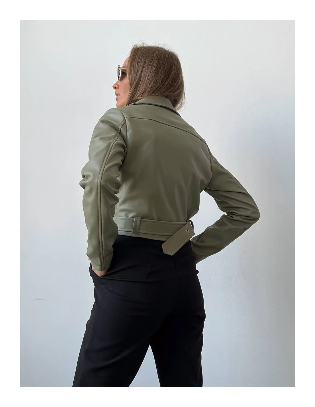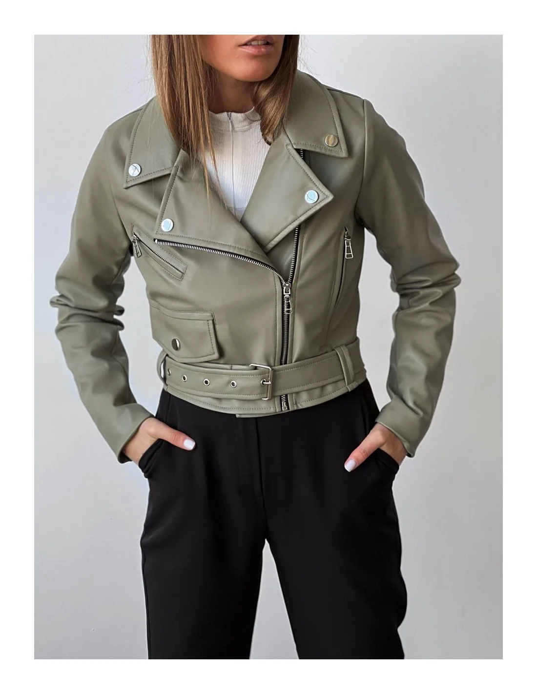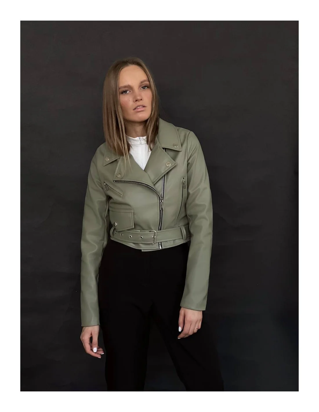 Женская кожаная куртка - Укороченная косуха - Оливковый цвет