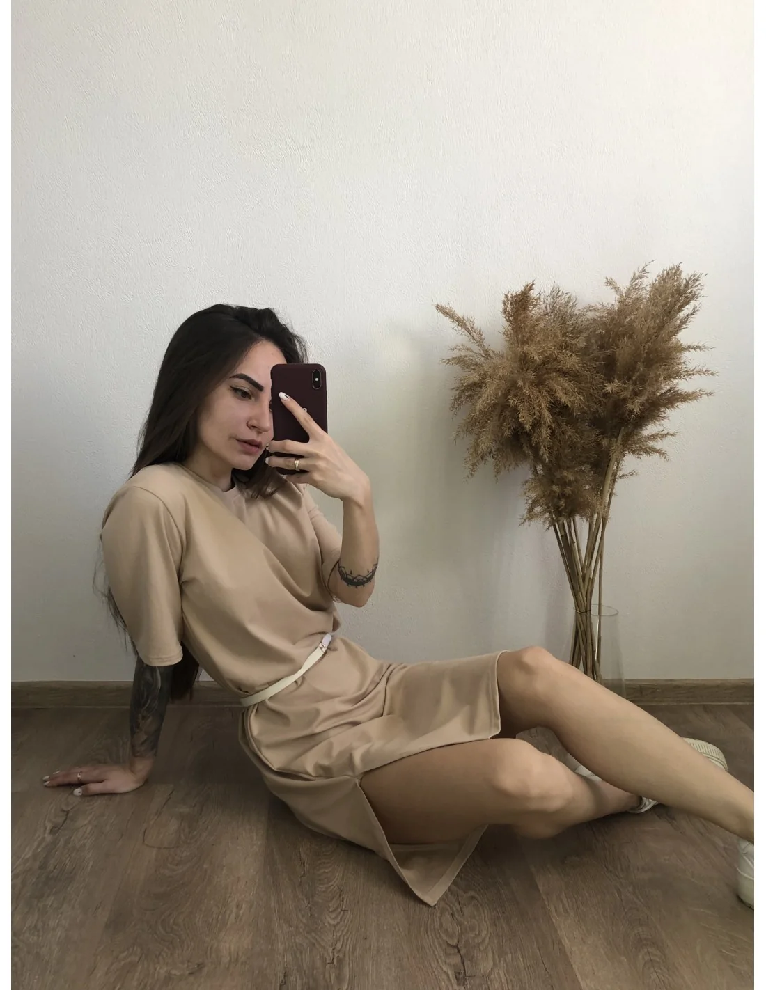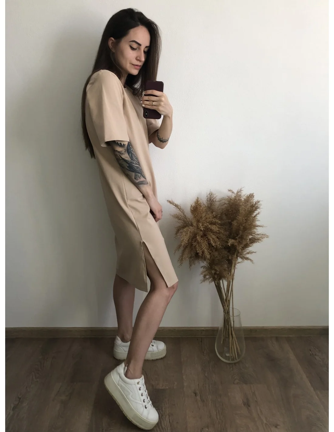Платье-футболка бежевого цвета с разрезом на правой стороне
