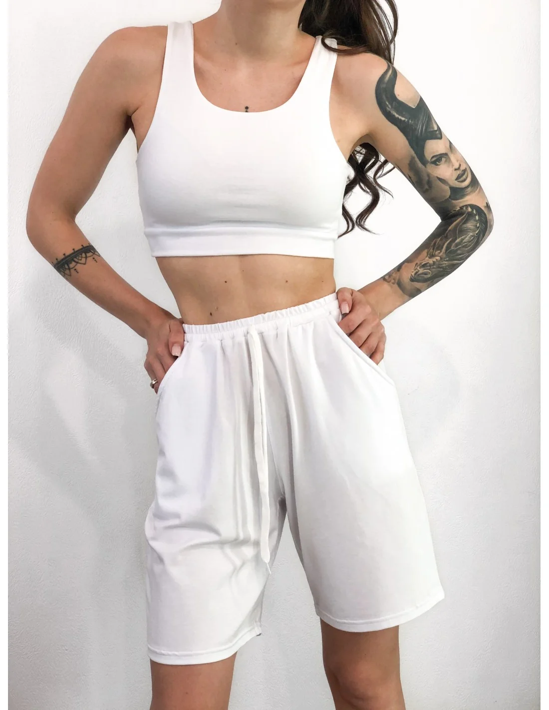 Модель наших шортів представлена у трендовому кольорі - білому. Цей колір завжди актуальний та підходить для будь-якого випадку. Він ідеально поєднується з різним верхнім одягом, що дозволяє вам створювати різноманітні образи. Наша модель шортів має спортивний стиль, що робить їх універсальними та придатними як для активних тренувань, так і для повсякденного носіння.