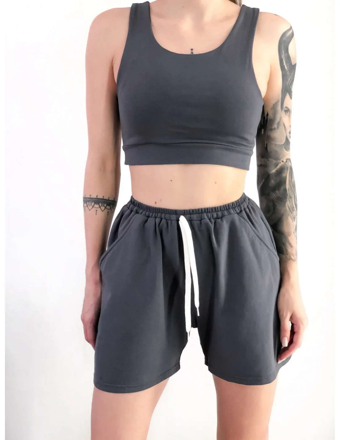 Цей костюм у графітовому кольорі - ідеальне поєднання стилю та комфорту. Він складається з топу та коротких шортів, що робить його ідеальним вибором як для повсякденного образу, так і для активного відпочинку. Базовий графітовий відтінок забезпечує універсальність, що дозволяє вам легко комбінувати різні елементи.