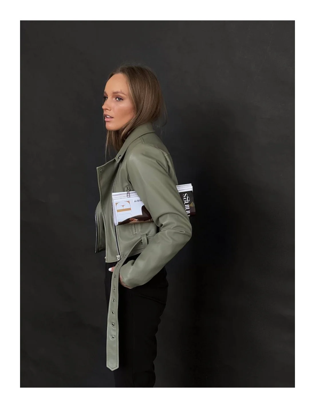Жіноча шкіряна куртка - Укорочена косуха - Оливковий колір