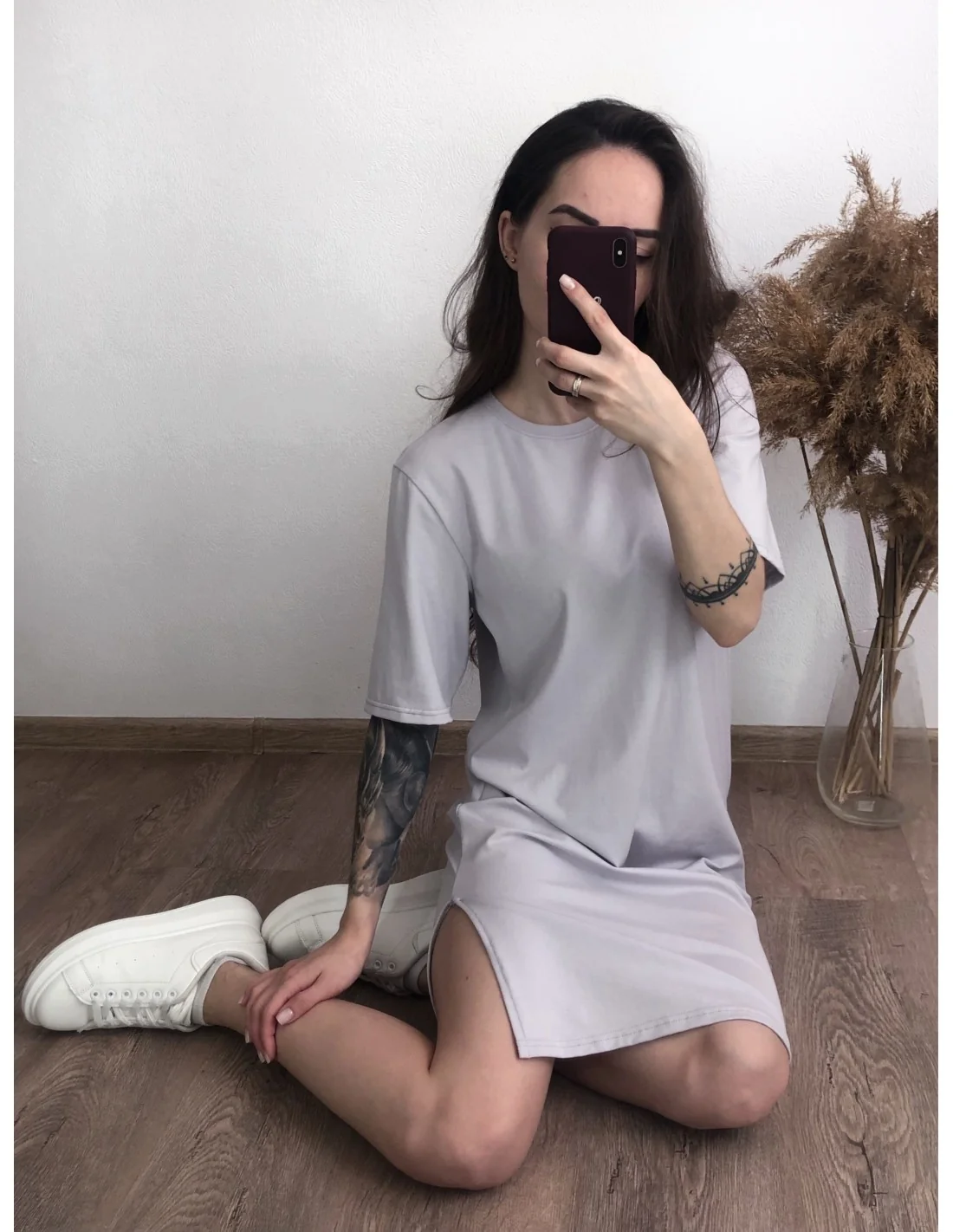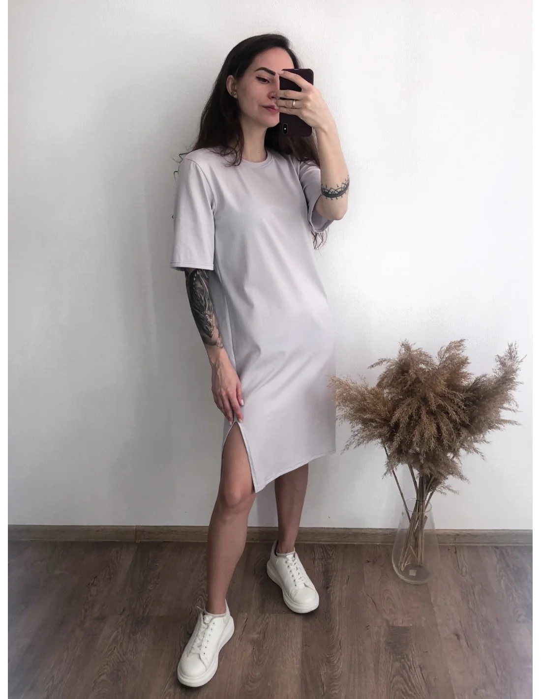 Ідеальний вибір для стильних та сучасних жінок, які цінують комфорт та оригінальність. Ця сукня-футболка у кольорі "камінь" з розрізом на правій стороні – ідеальне поєднання стилю та зручності.